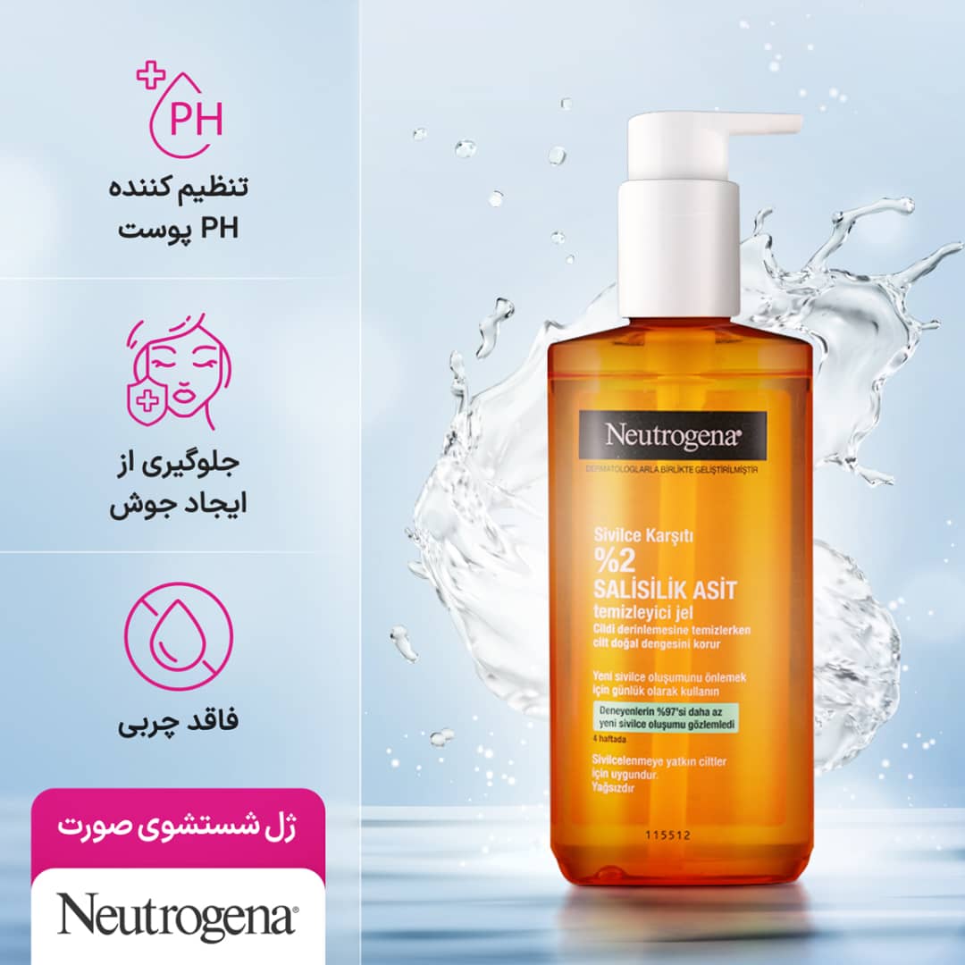 ژل شستشوی صورت نوتروژینا حاوی سالیسیلیک اسید ۲% حاوی سالیسیلیک اسید ۲% پاک کننده عمیق پوست کاهش جوشهای سر سفید و سر سیاه کنترل کننده چربی پوست لایه بردار ملایم پوست حجم ۲۰۰ میلی لیتر